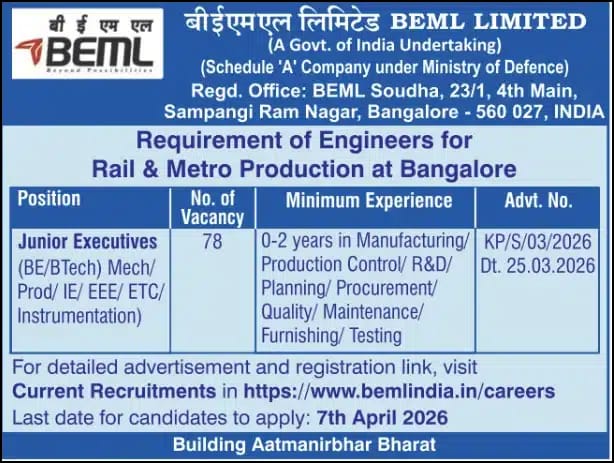 Tags: job in bangalore govt job in karnataka job in west bengal private job in bangalore btech jobs in bangalore rail metro job beml recruitment 2026 fresher jobs in bangalore mechanical engineering jobs in karnataka sarkari naukri