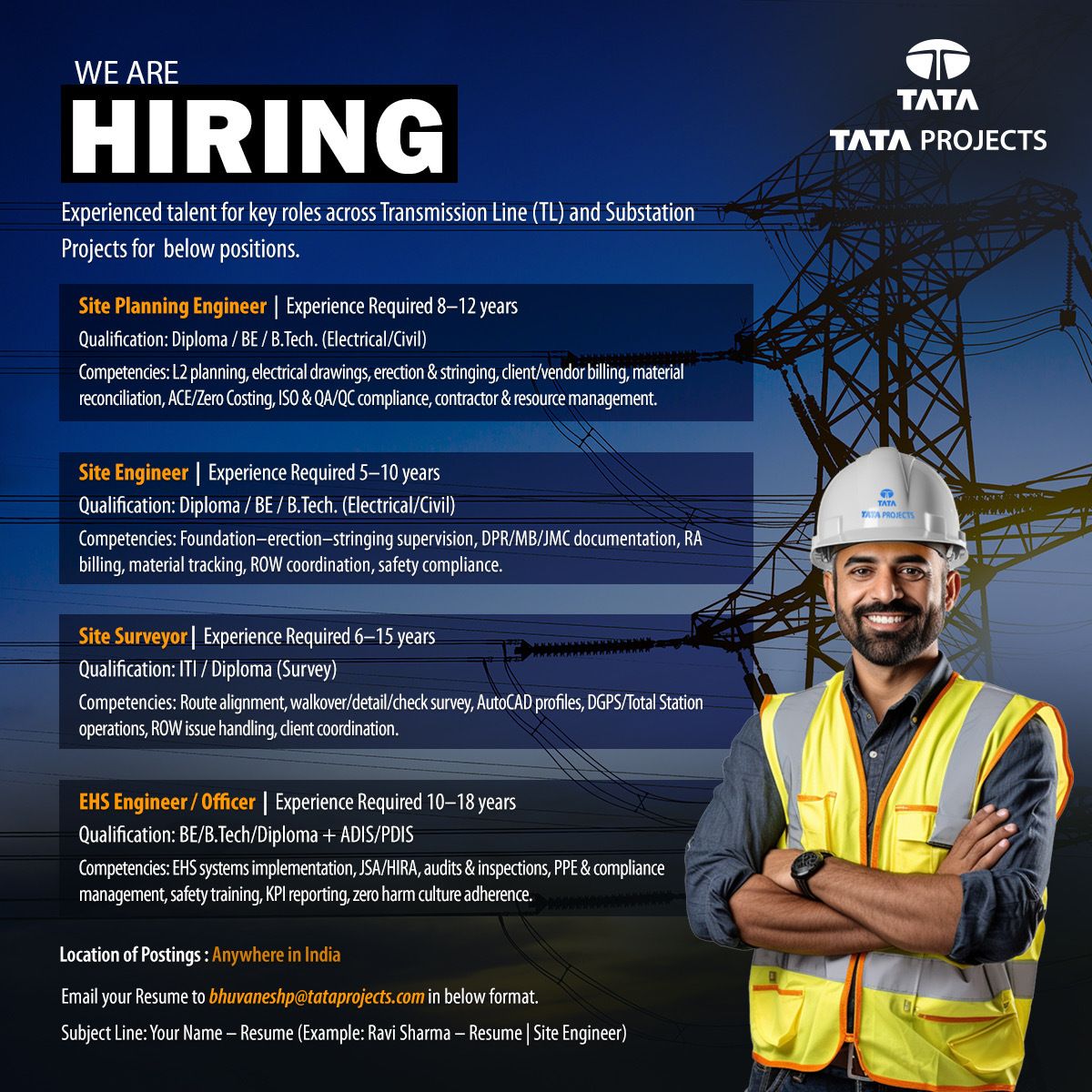 Tata Projects Bharat ki sabse badi infrastructure aur construction companies mein se ek hai. Yeh mass hiring khaskar unke Transmission Line (TL) aur Substation Projects ke liye ki ja rahi hai. Agar aapne power sector, grid connectivity, ya high-voltage transmission lines ke projects par kaam kiya hai, toh yeh vacancy aapke skills ke hisaab se bilkul perfect hai.