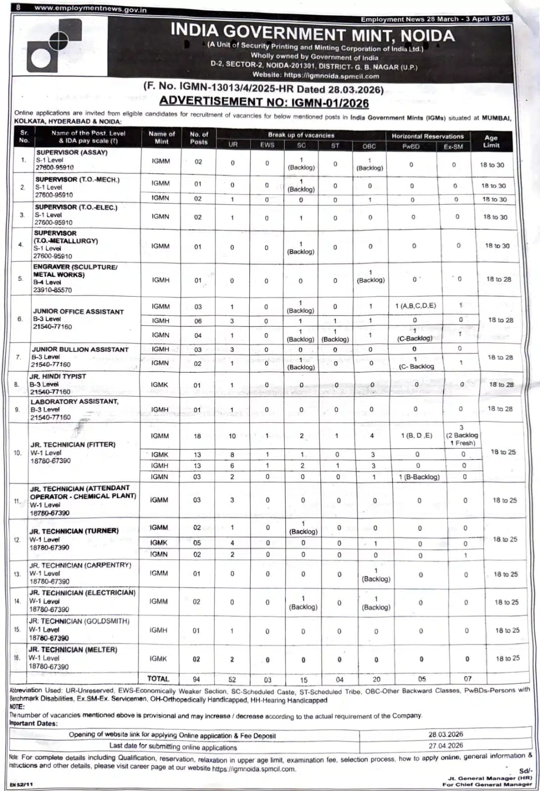 India Government Mint (IGM) Noida Recruitment 2026 – 94 Posts Apply Online
