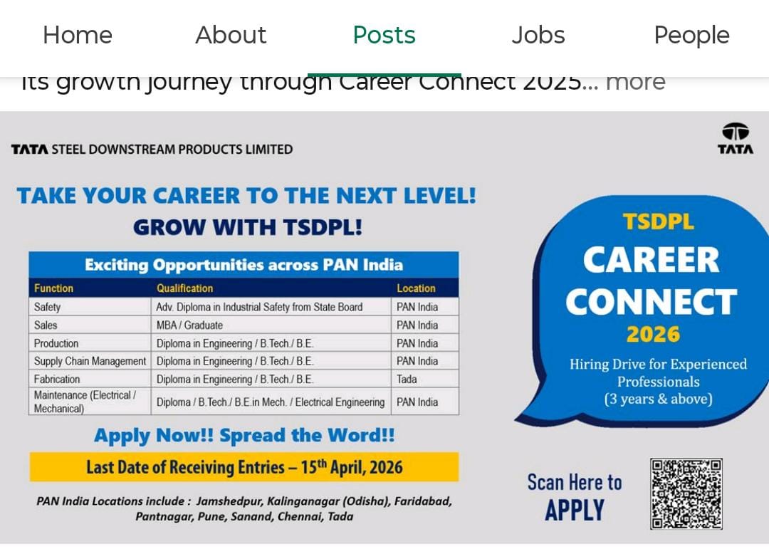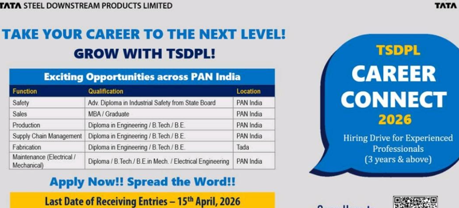 Agar aap ek Experienced Professional hain aur Tata Group ke saath apna career grow karna chahte hain, toh yeh aapke liye ek sunhara mauka hai. Tata Steel Downstream Products Limited (TSDPL) ne apni hiring drive “Career Connect 2026” ka aailan kar diya hai. Yeh bharti PAN India locations jaise West Bengal, Jamshedpur, Tada, aur Pune ke liye nikali gayi hai.
